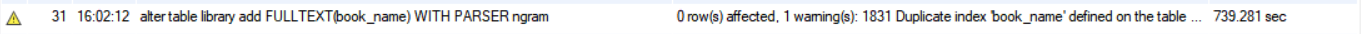 739초가 걸려 책 제목 컬럼으로 Stop-word 기법의 FULLTEXT 인덱스를 생성 하였다.